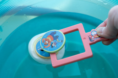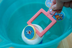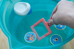 「みんなをたすけよう!ドラえもんのディスクすくい」は、水に浮かべたディスクをポイを使ってすくい、映画に出てくるひみつ道具「カメレオンぼうし」の上に乗せて遊ぶおもちゃ。このディスクすくい、簡単そうに見えてなかなか難しいぞ! ゆっくり慎重にやってみよう。