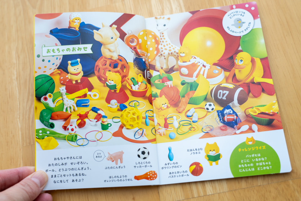 1冊目は絵本「ノラネコぐんだん おみせでさがしえブック」。工藤ノリコさん作の大人気絵本シリーズ「ノラネコぐんだん」の探し絵ブックとなっている。物語の舞台となっている“おみせ”は、おもちゃのおみせから始まって、はなのおみせ、しょっきのおみせ…と11パターンと見ごたえたっぷり。8匹で行動するノラネコぐんだんやワンワンちゃん達の姿にほっこりするぞ。