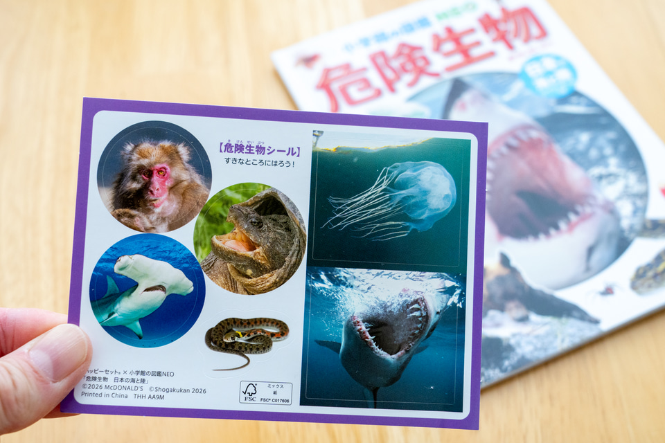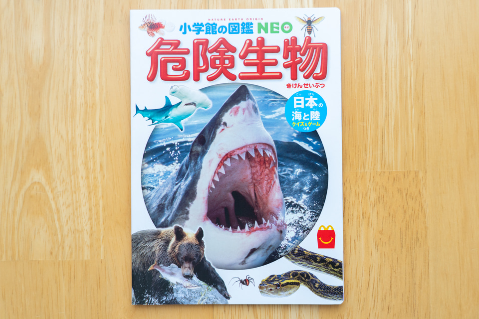 2冊目はミニ図鑑「小学館の図鑑NEO 危険生物」。現在の日本に生息している海と陸の危険生物にスポットを当てた興味深い図鑑となっている。中でも、するどい歯でかみついたり、ひっかいたり、毒牙や毒針で刺したりする生き物を主に紹介している。じっくり解説を読んで、後半の「危険生物クイズ」に挑戦しよう。