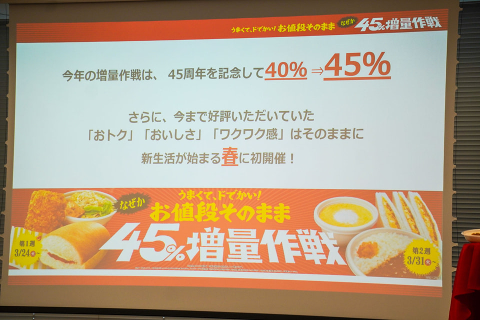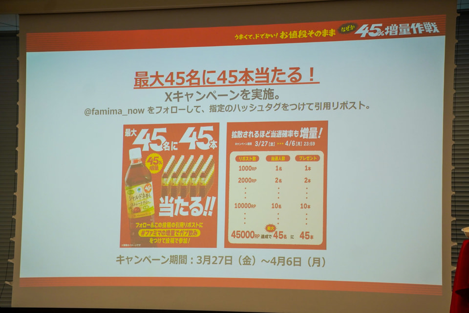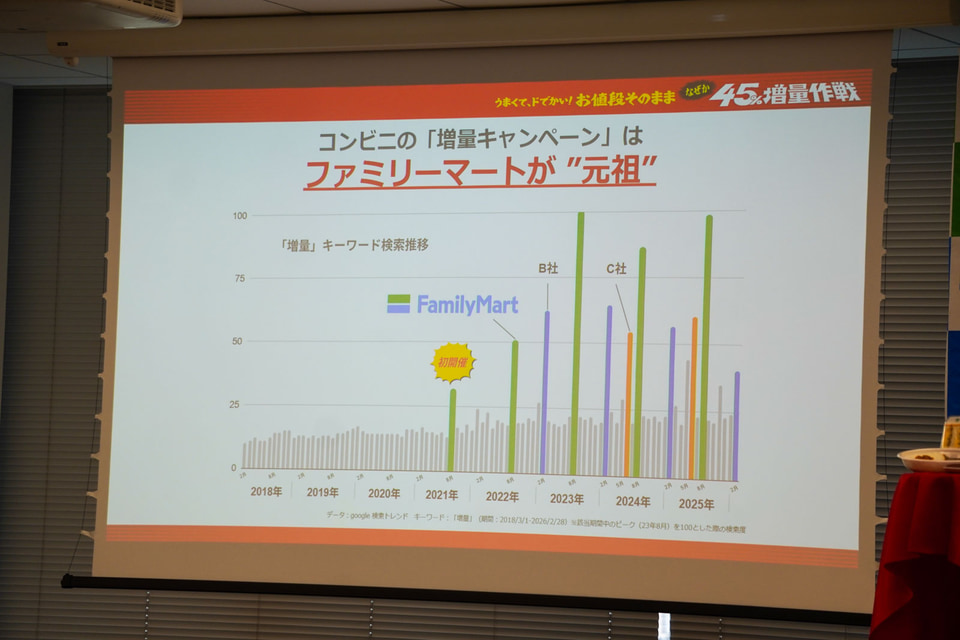 阿部氏はファミマが45周年を迎える中で、「45周年大感謝祭」や「おトクな割引」などを実施していることを紹介。「増量作戦」は40周年企画として2021年開始後から毎年実施しており、増量キャンペーンの元祖であること、“増量”の検索キーワードの推移が年々伸び、ユーザーの期待感が高いことを示した。「今年は増量を従来の5%アップさせて45%にし、新生活が始まる春に開催することでワクワクを提供したい」と話した。
