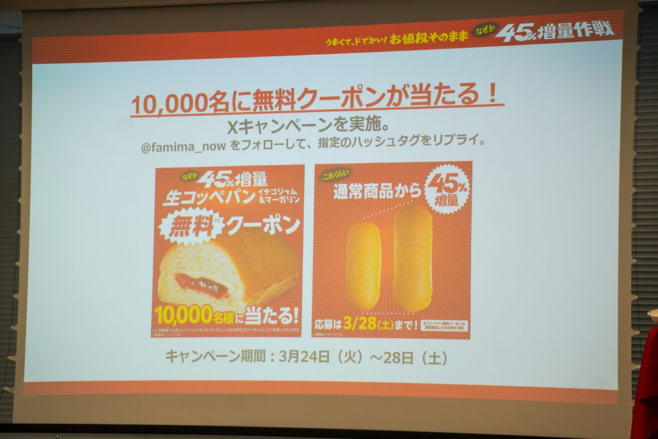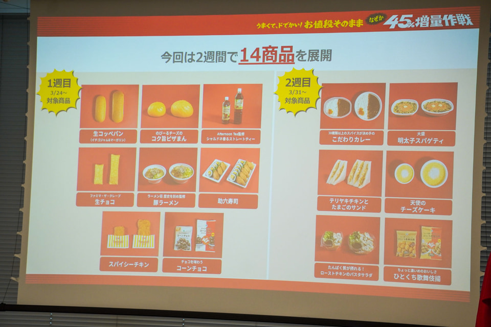 ファミリーマートは、生コッペパンやスパイシーチキンなどの14商品を値段はそのままに増量する「うまくて、ドでかい!お値段そのまま なぜか45%増量作戦」キャンペーンを3月24日に開始する。