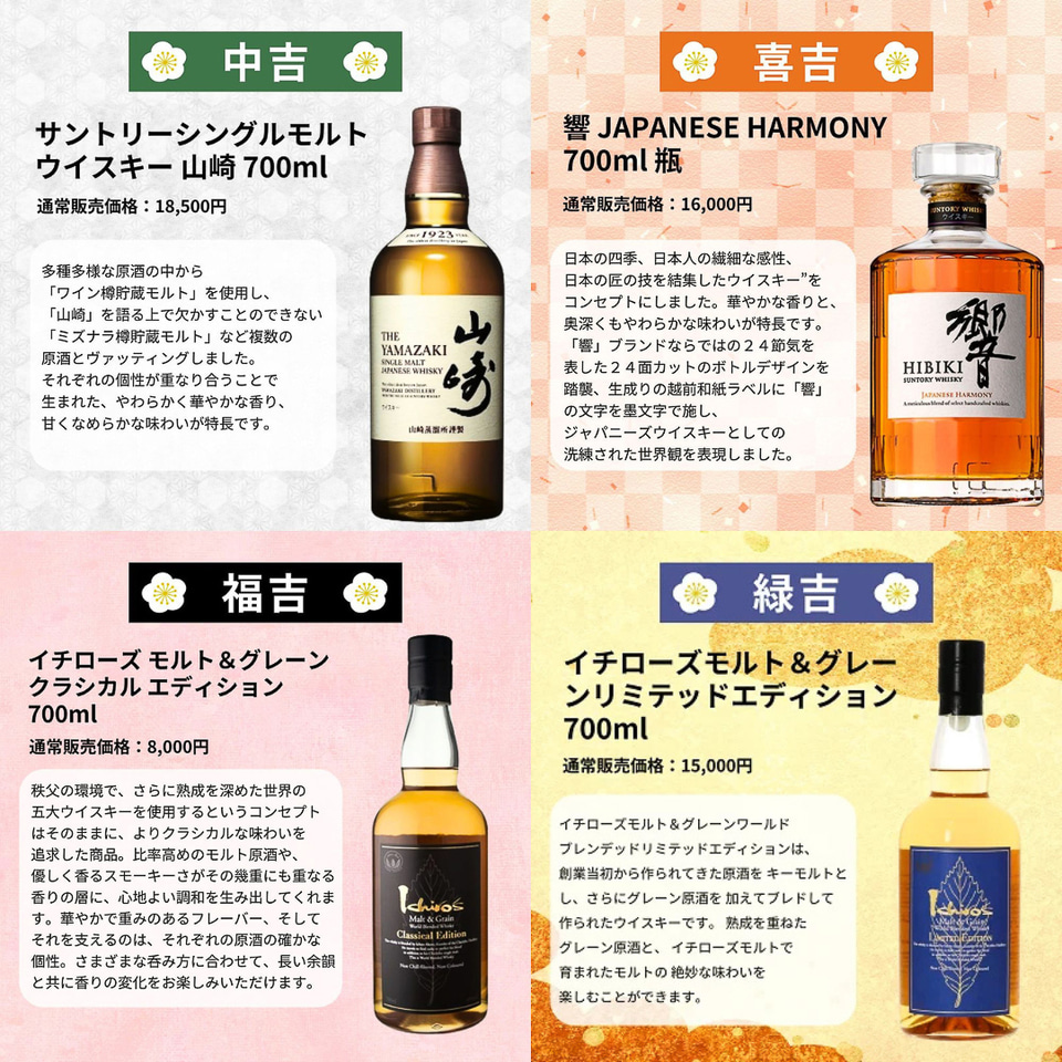 1口3980円の抽選販売で、メーカー希望小売価格「6万500円」の「シングルモルトウイスキー山崎18年」が1等(超大吉)になっており、ほかにも、希望小売価格「1万6500円」の「山崎12年」(2等:大大吉)や「白州12年」(3等:大吉)などが当たるチャンスとなっている。