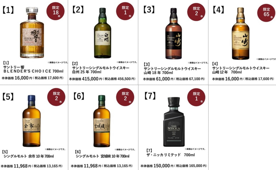 イオン、ウイスキー「白州25年」「山崎18年」「山崎12年」「余市10年」「宮城峡10年」など抽選販売