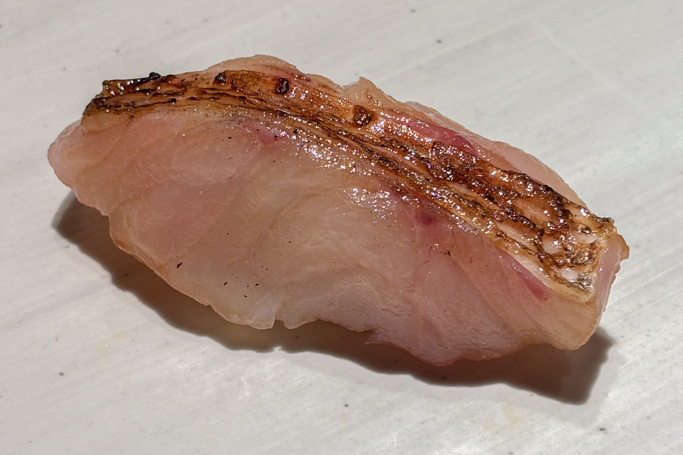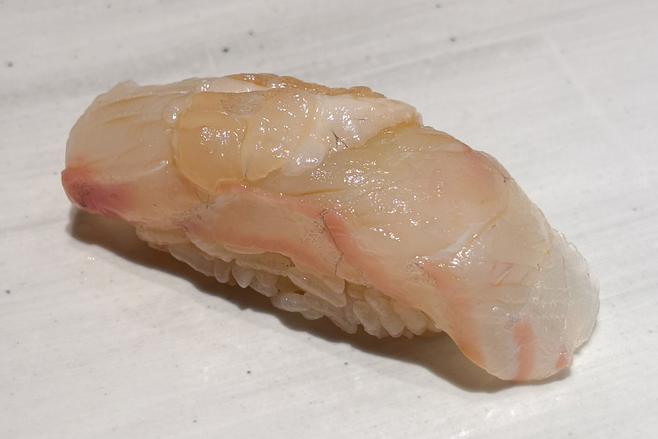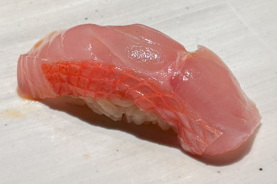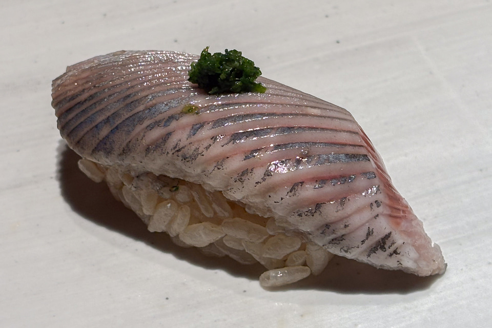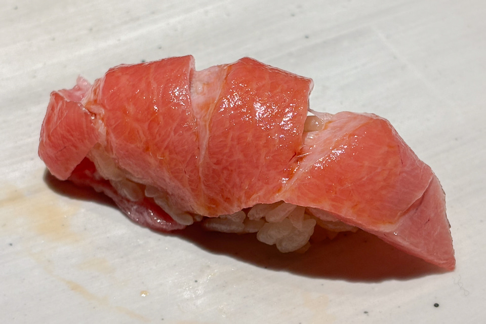 ここから赤ワインと鮨のマリアージュが始まる。しかも青魚の鰯から。でも今夜は当然合ってしまう。青魚の臭みが云々なんて野暮なことを言う隙はなく、ただただきれいに旨みだけを感じる鰯で、そのオイリーさの融点を、このピノ・ノワールが知っていたかのようにぴたりと合わせる。これは「白身のトロ」と呼ばれるのどぐろの脂のりのよさでも同じことを感じた。