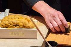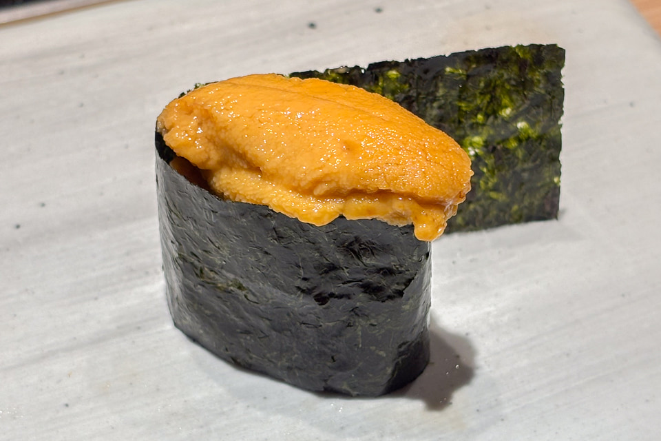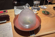 そして豊洲市場のその日の“一番雲丹”が登場。箱雲丹のお披露目で、圧倒的な存在感にテンションが上がり、そして期待を裏切らないきれいな味が、ピノ・ノワールとも合ってしまう。ザンダーソーレンワインズ全般に言えることだが、エレガントさ、繊細さが、日本料理の繊細さと抜群に相性がよい。