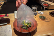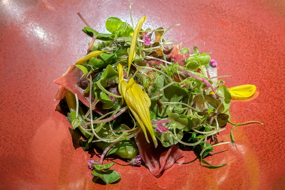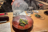 ここでスモークの気配を感じながらいただくお野菜と平貝。野菜の苦み、平貝の旨み、まだ残るスモーキーさに、ワインのフレッシュな果実味がとても合う。