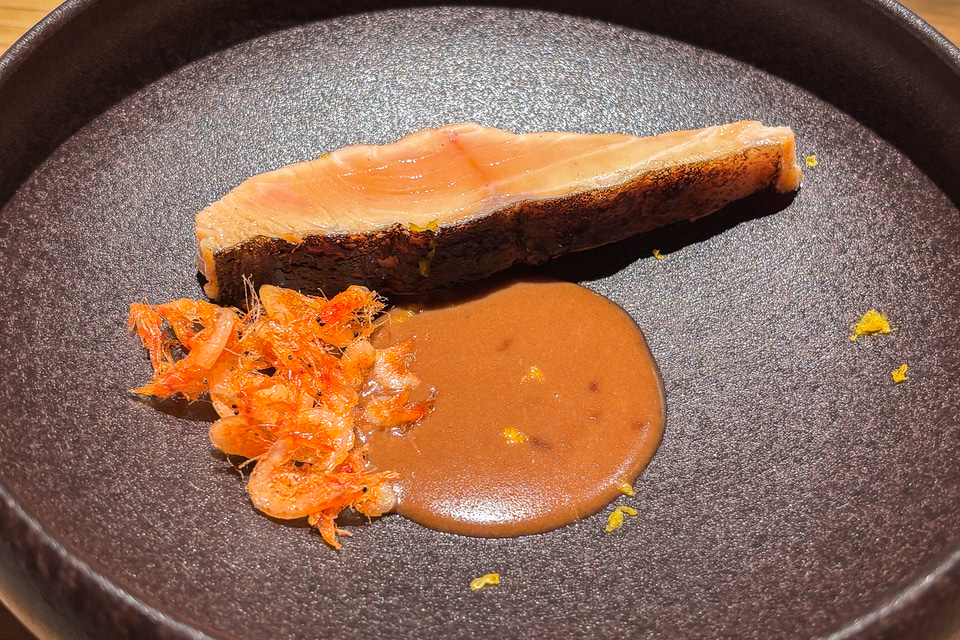 ここで、火を通した魚に対してHABARIが再び登場。海老の甘みとミソのコクを感じるソースにシャルドネが合う。ちょっとソーヴィニヨン・ブランのようなフレッシュさが、桜海老の香りをさらにブワッと立ちのぼらせてくれるよう。