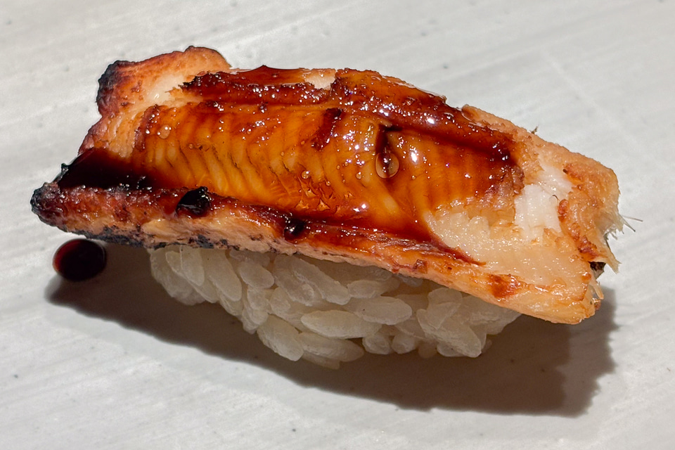 握りの最後は富津の穴子。個人的に穴子は白ワインと合わせても、場合によっては日本酒と合わせても最後に臭みが立ってしまう難しい相手(好きなんだけど)という印象だが、ここまでくると安心と期待しかない。しっかりめの果実味のあるワインが、骨からダシをとったというタレをまとった穴子を受けとめてくれる。飲み込んだあとも、何も雑味が昇ってこず(お見事です)ただただふっくらとした穴子の食感、香ばしさ、旨みを堪能できた。ここまでジューシーだと焼鳥などとも合わせてみたい気持ちになった。