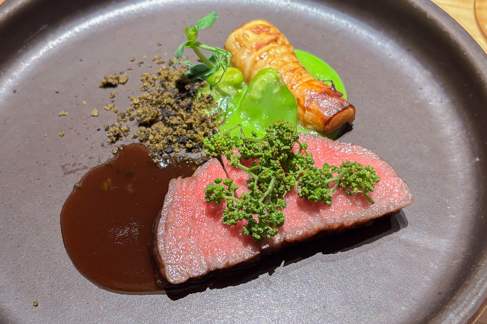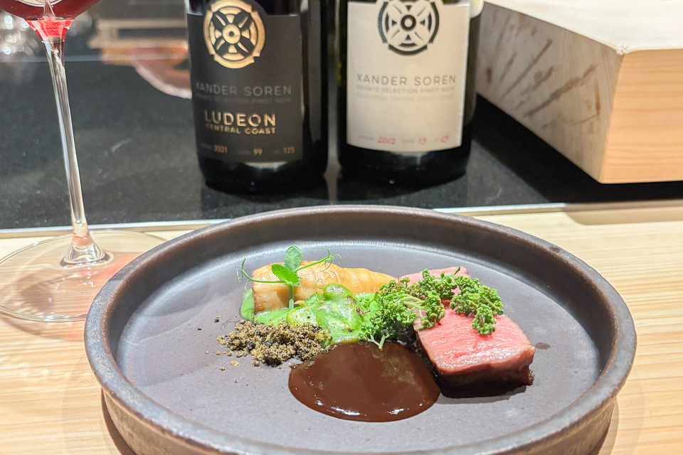 いよいよラスボス、ザンダーソーレンワインズのシグネチャー「ルデオン」と仙台牛が登場する。「牛肉のステーキと合わせるならカベルネ・ソーヴィニヨン……」なんて今夜は言うはずもない。カベルネ・ソーヴィニヨンの渋みを必要としない優れた和牛の低い融点により、情報量の多いおいしさを、フラグシップのワインが寄り添い、私たちに教えてくれる。BBQに安うまチリカベを合わせるのとはあまりに隔絶した、和の静謐の中で、和牛のおいしさとじっくり向き合うことができるようで、結局最後の最後まで「うまい」と言い続けるしかなかった。