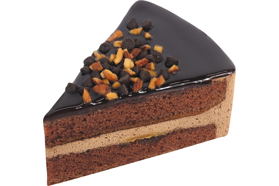 ココアスポンジにガナッシュホイップ、キャラメルソースを重ね、上面はチョコグラサージュで仕上げた、チョコを存分に楽しめる商品。食感のアクセントとして、チョコチップとキャンディングアーモンドをトッピングしている。