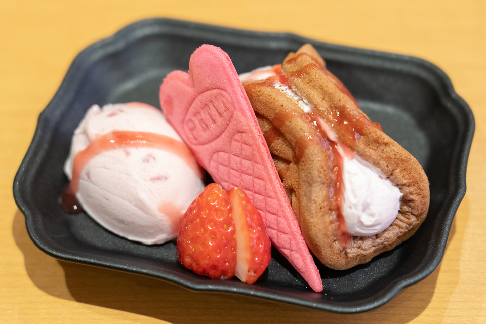 SUSHIRO Cafeからは、2種類の新作スイーツが登場している。「フレッシュ苺&苺のココアオムレット 苺アイス添え」は、フレッシュ苺をトッピングしたぜいたくスイーツ。ふわふわ生地のココアオムレットに挟まれているのは果肉入りのジャムと苺のホイップだ。苺味のアイスと交互に食べながら楽しんでみて。ハート型のサクサクな焼き菓子もよいアクセントになっていた。