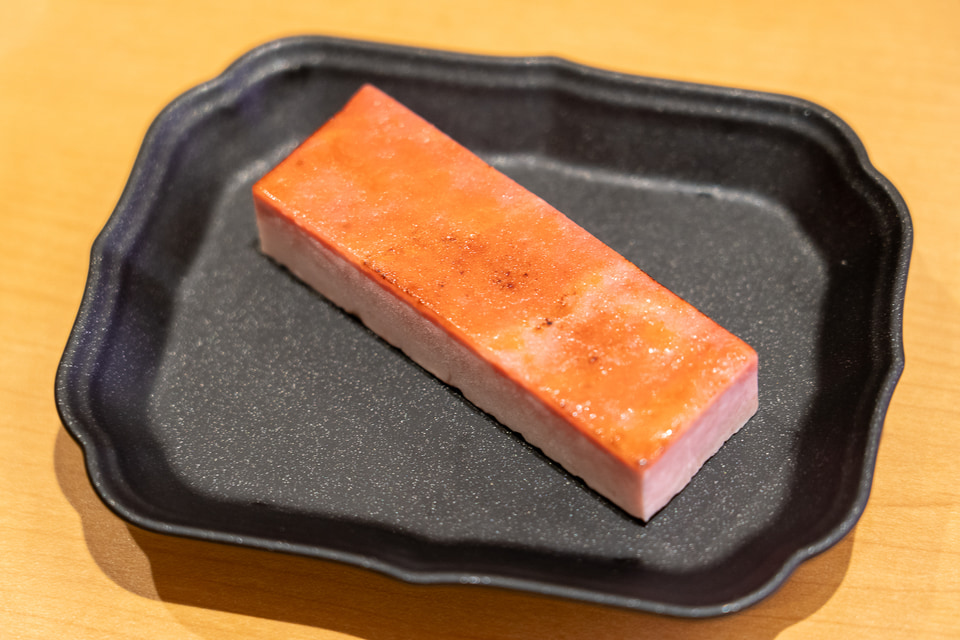 「煎り酒漬け赤えび」は、ふり塩で旨みを引き出した天然赤えびを“煎り酒漬け”にしたもの。だしの旨みがプラスされて通っぽい味に!食通さんにぜひ味わってみてほしい一皿だった。