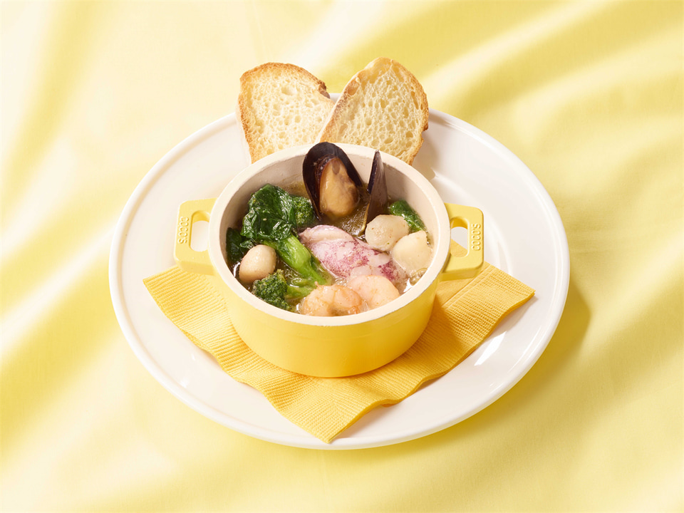 春が旬の菜の花を使った「菜の花とシーフードのアヒージョ」は、ガーリック香るオイルソースが、菜の花やシーフードの旨みを引き立てる一品。菜の花、ムール貝、海老、小柱、イカといった具材たっぷりのオイルソースに、添えられたバゲットを浸して楽しめる。追加のバゲットは66円。