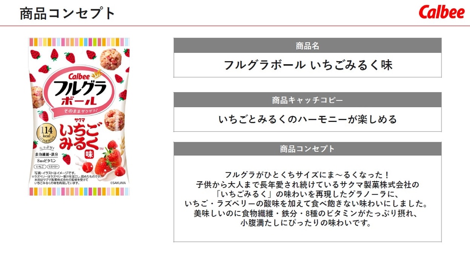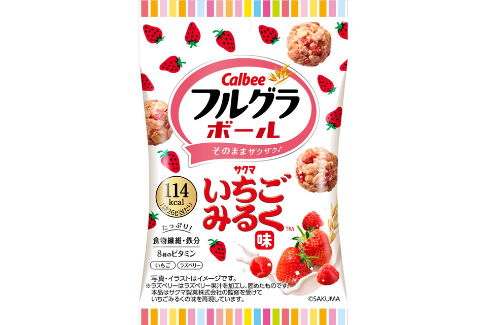 カルビーはサクマ製菓のキャンディ「いちごみるく」とコラボレーションし、「フルグラボール いちごみるく味」を発売する。全国のコンビニエンスストアとカルビー直営店「カルビープラス」では4月6日より先行販売を行ない、そのほか店舗では4月13日に販売する。