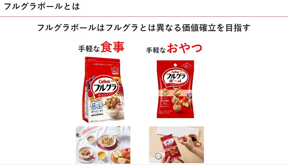 大本氏は「フルグラ」が2026年に35周年を迎えることを紹介し、食事を摂りそびれてしまう人に向けてより訴求していくことを説明。また「フルグラボールは手軽なおやつとして食べてもらい、フルグラとは別の価値を確立していきたい」と述べた。