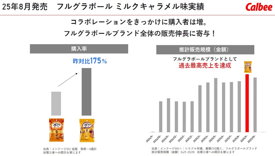 そしてマーケティング本部 シリアル部 フルグラチーム 寺澤妃奈乃氏が商品の詳細について説明した。寺澤氏は2025年8月に発売した「フルグラボール ミルクキャラメル味」は購入率が昨対比175%、同ブランドで過去最高の売上を達成したと報告し、「『いちごみるく』とのコラボでブランド価値向上につなげたい」と語った。