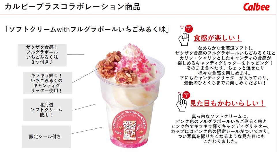 さらに、カルビーのアンテナショップ「カルビープラス」ではカフェメニューとして「ソフトクリームwithフルグラボールいちごみるく味」を販売するほか、Xキャンペーンも行ない、販売を盛り上げていく。