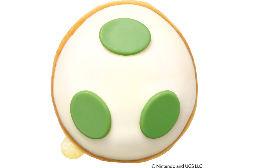 ヨッシーのタマゴがドーナツに!? コクのあるミルキーなホワイトチョココーティングの上に緑色のプレートチョコをのせて、中には北海道産ミルク入りのカスタードクリームを詰めた。