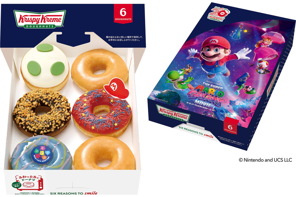 映画「ザ・スーパーマリオギャラクシー・ムービー」をイメージした「マリオ ストロベリー」「ヨッシー カスタード エッグ」「チコ&ブルーベリー ギャラクシー」に、定番の「オリジナル・グレーズド」と「ダブル チョコ クランチ」を合わせた6個入り。