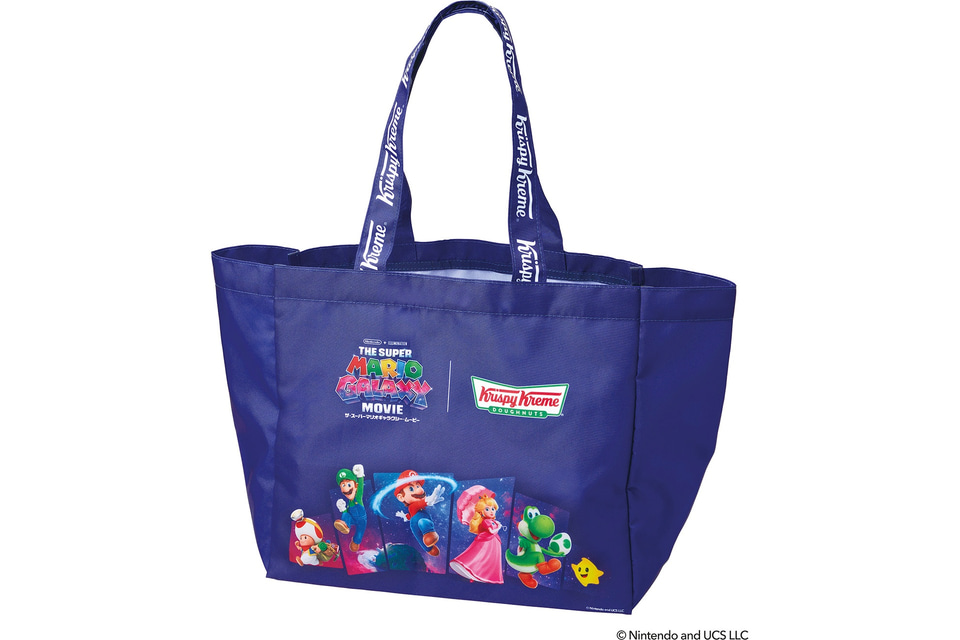 映画「ザ・スーパーマリオギャラクシー・ムービー」デザインの限定バッグ。クリスピー・クリームのハーフボックス(ドーナツ6個用)が最大で4箱入る。大容量なうえに肩にかけられる長さなので、買い物にもぴったり。