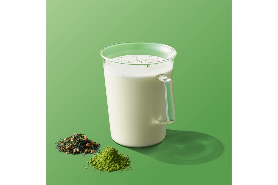 煎茶ブレンドの茶葉をじっくりと抽出し、ミルクと合わせ、一杯ずつ茶こしを使って丁寧に仕上げる煎茶のティーラテ。青々しい香り、玉露のうまみ、玄米の香ばしさ、焙煎玉露と焙煎茎茶のコクを感じられるようにブレンドした煎茶をミルクと合わせてクリーミーに仕上げ、抹茶パウダーをトッピングした。