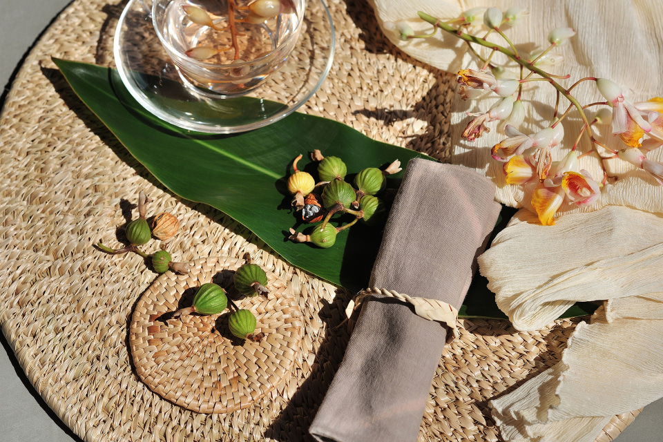 テーブルには月桃を編んだマットや月桃染めのテーブルセンターもあり、沖縄生まれの工芸品が華やかに彩る。ティースタンドには、王朝時代よりもてなしに用いられる「牡丹」や「オナガドリ」などの彫りが施されており、琉球から続く技に触れることができる。