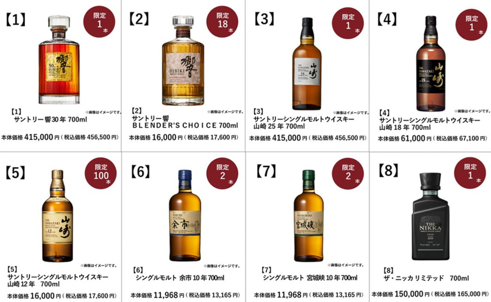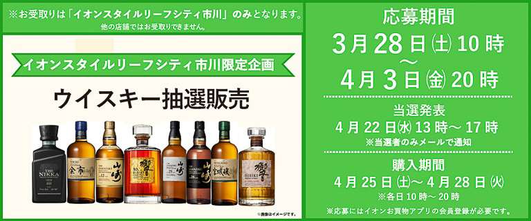 受付はWebサイト、当選者の受取はイオンスタイルリーフシティ市川となる。サントリーウイスキーの「響30年」「山崎25年」「山崎18年」や、ニッカウヰスキーの「余市10年」「宮城峡10年」「ザ・ニッカ リミテッド」など希少なウイスキーを購入できるチャンスとなっている。