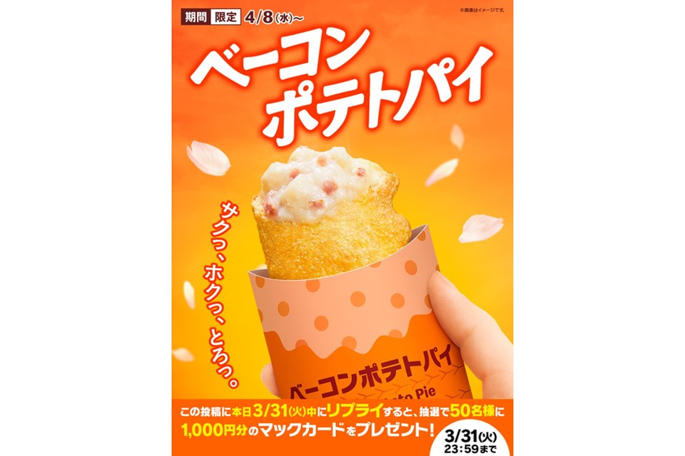 応募方法: マクドナルド公式Xアカウント(@McDonaldsJapan)をフォローし、「#ベーコンポテトパイが帰ってくる」のハッシュタグがついた投稿に「#ベーコンポテトパイが帰ってくる」のハッシュタグを付けてリプライ(返信)する