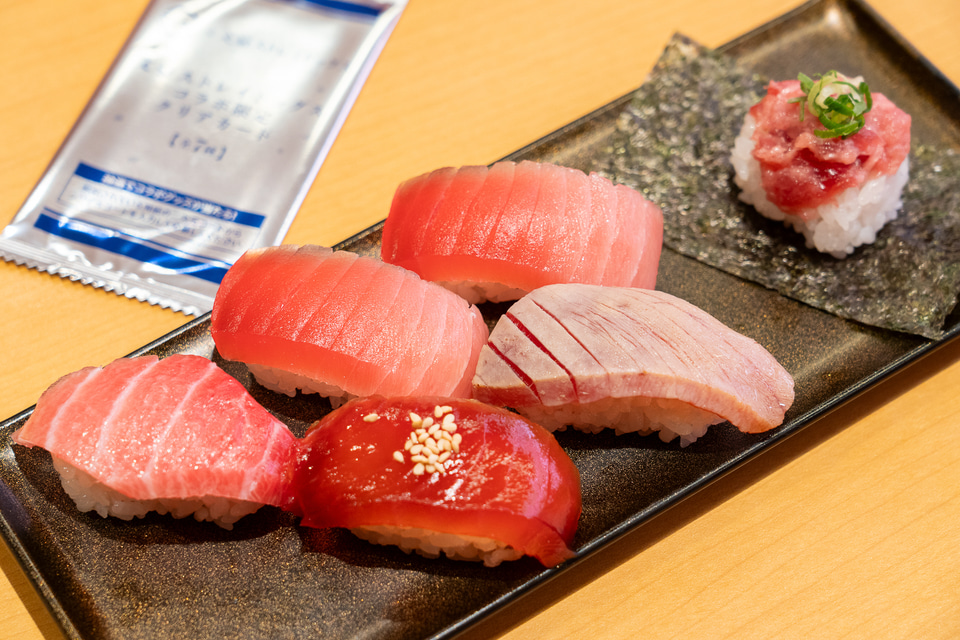 天然インド鮪の部位と仕立てを変えた6貫が食べ比べできる贅沢プレートは個人的にイチオシ! 内容は、大とろ1貫、中とろ2貫、炙り中とろ1貫、漬け赤身1貫、ねぎまぐろ包み1貫で、脂の甘みが魅力の天然インド鮪をまるごと堪能できる盛り合わせとなっている。なお、コラボ商品ではない通常の「天然インド鮪6貫盛り」もあるので、注文の際はご注意を!