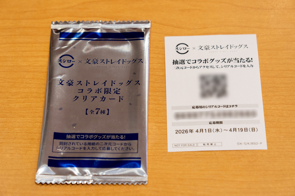 コラボ限定クリアカードに同封されている別紙の二次元コードにアクセスし、シリアルコードを入力すると抽選で100名に文豪ストレイドッグスコラボ限定等身大のぼり7種セットが当たるキャンペーンに参加できる。応募期間は4月1日~19日。