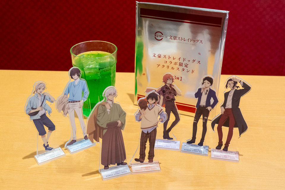 「文豪ストレイドッグスコラボ限定アクリルスタンド付き ソフトドリンク」は、ウーロン茶、ペプシコーラ、ポップメロンソーダ、ホワイトウォーター、ホワイトソーダの5種類が対象となる。アクリルスタンドは全3種で、対象ドリンク1点につきランダムで1セット提供される。