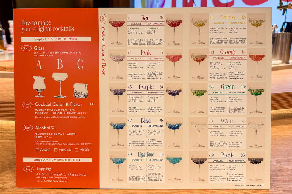 モバイルオーダーとなるSUMADORI Customは3ステップ。まずはグラスを3種類から選ぶ。次に全20種類のカクテルから「ピンクのスパークリング」「ライトブルーのノンスパークリング」というように好きな色と味わいをチョイス。続いて、気分や体質に合わせてアルコール度数(0%/0.5%/3%)を選ぶという流れだ。店舗スタッフが席に持ってきた際に好きなトッピングで仕上げて完成となる。
