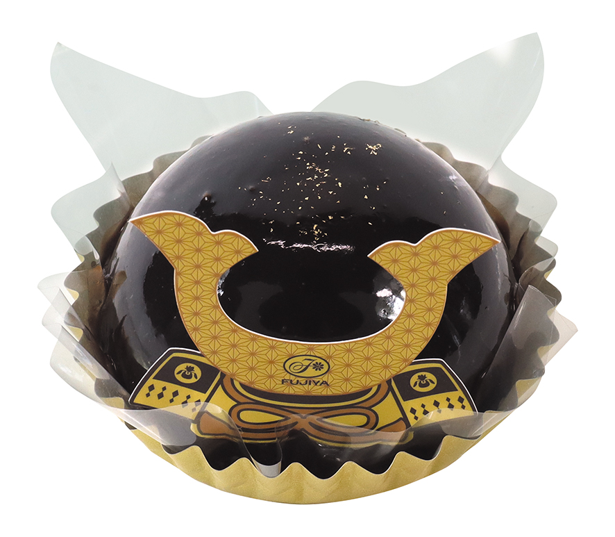 ココアスポンジにプリン、チョコムースを重ね、チョコグラサージュでコーティングしたかぶと型のケーキ。上面は金粉で華やかに仕上げた。