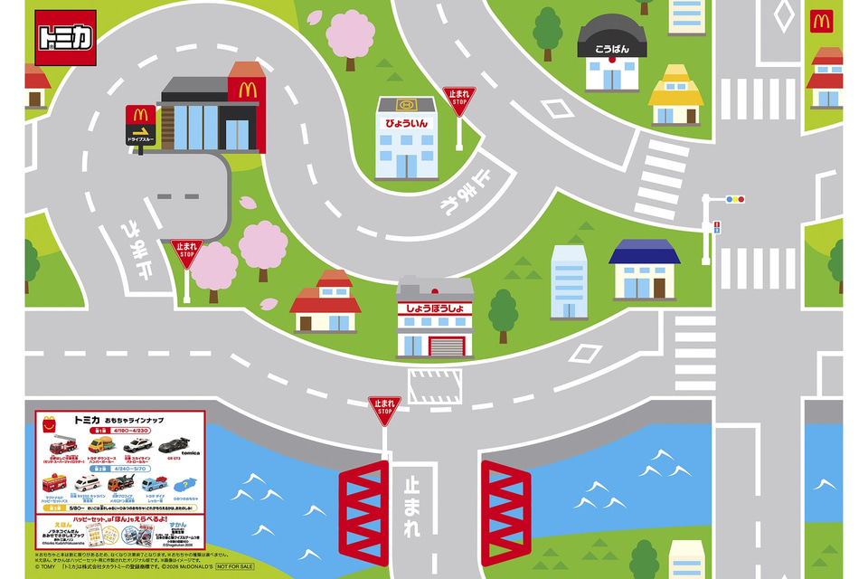日本マクドナルドはハッピーセットで「トミカ」を4月10日に発売する。期間を分けて、それぞれ別のおもちゃを提供する。
