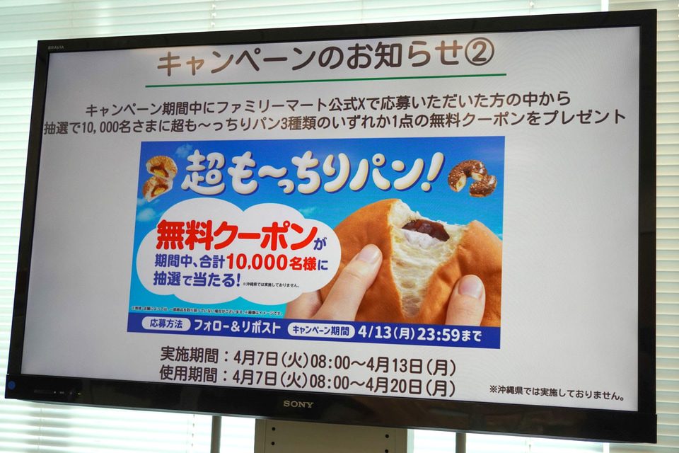 また、4月7日~20日には「ファミマルBakery」のパン1品ン購入で20円引きのレシートクーポンがもらえるキャンペーンや、「超も~っちりパン」の無料クーポンを配布するXキャンペーンなども実施する。