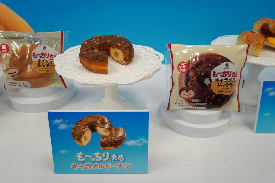パン生地の食感をもっちりを超えた“超も~っちり”を目指して開発した商品で、「超も~っちり食感キャラメルドーナツ」(178円)は、も~っちりとした食べ応えのあるドーナツ生地に、キャラメルクリームを絞った。「超も~っちり食感ホイップあんぱん」(158円)は、も~っちり感と柔らかさを兼ね備えたパン生地に、こしあんとミルクホイップを入れ、「超も~っちり食感ピザパン」(198円)はも~っちり食感の生地にピザソースとチーズソースを包んだ。