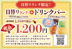 また、新たに日替わりランチ(1078円)とドリンクバー(250円)をお得に楽しめるドリンクバーセットも1200円で用意する(1200円←1353円 ※153円お得)。