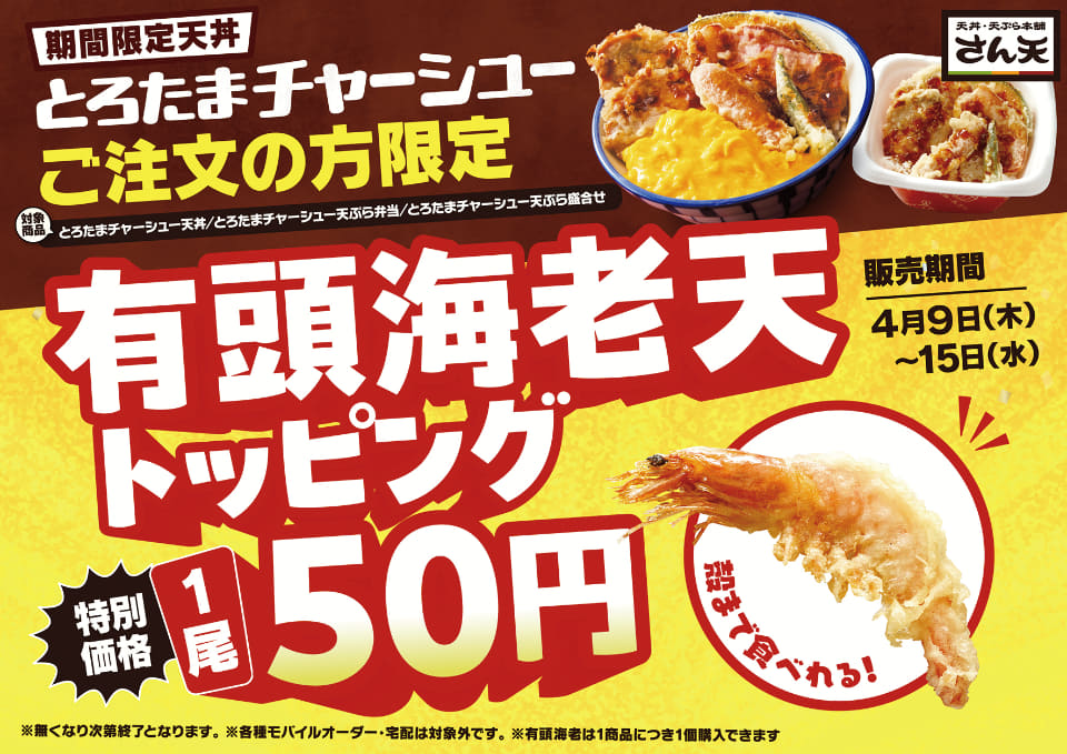 天丼・天ぷら店舗 さん天、天ぷらに濃厚たまごとオニオンソースが絡む「とろたまチャーシューフェア」実施