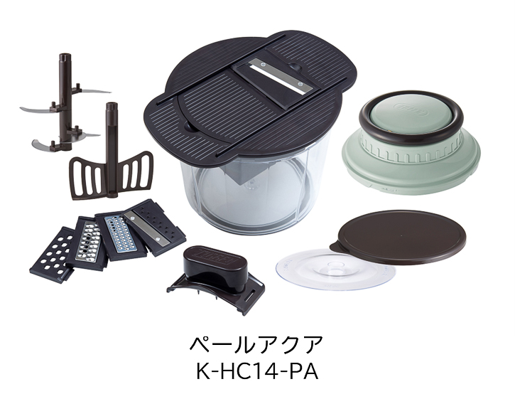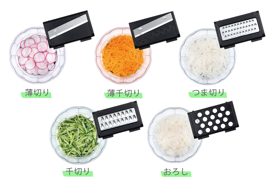 ハンドルを引くだけで食材の下ごしらえができる手動式の時短調理器具で、好評販売中の「ハンディチョッパー L」の「刻む」「混ぜる」「泡立てる」に加え、新たに「切る」「おろす」機能が追加された。薄切りや千切りなどに対応するカッターパーツも備え、1台で7通りの使い方ができる。