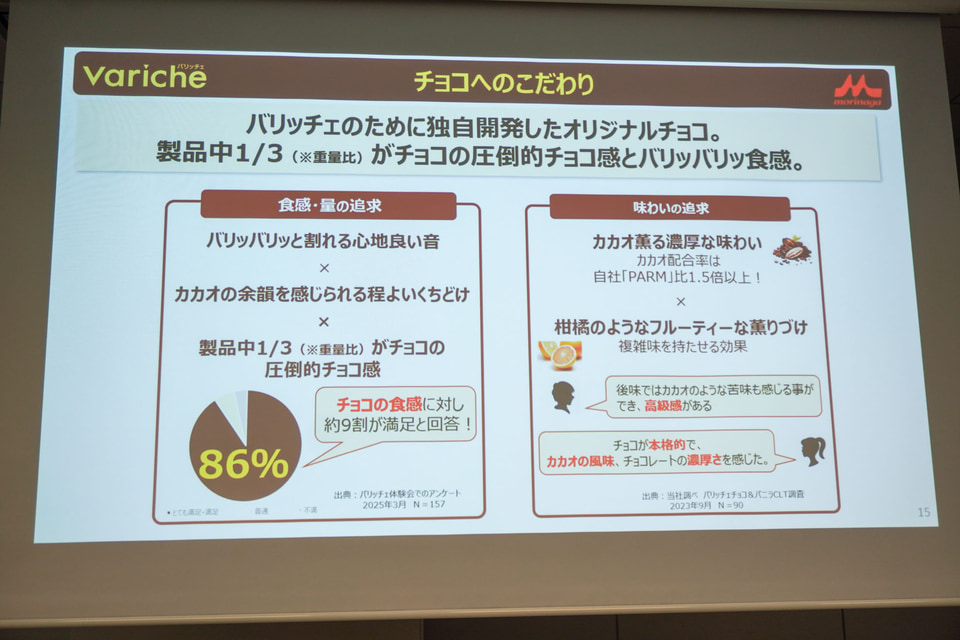 その後、研究本部 食品開発研究所 冷菓研究室マネージャー 佐々木慶一氏が商品開発のこだわりなどを紹介。製品中の3分の1をチョコレートが占めており、カカオ比率は「PARM」の1.5倍以上だという。「天面に広がるチョコレートは異なる厚みにし、中身のチョコレートも大きさが違うことで、ひとつとして同じものがない食感になっている」と佐々木氏は話した。また、全国展開に合わせてアイスクリーム部分は華やかな香り立ちやコクが感じられるよう、アップデートしているという。