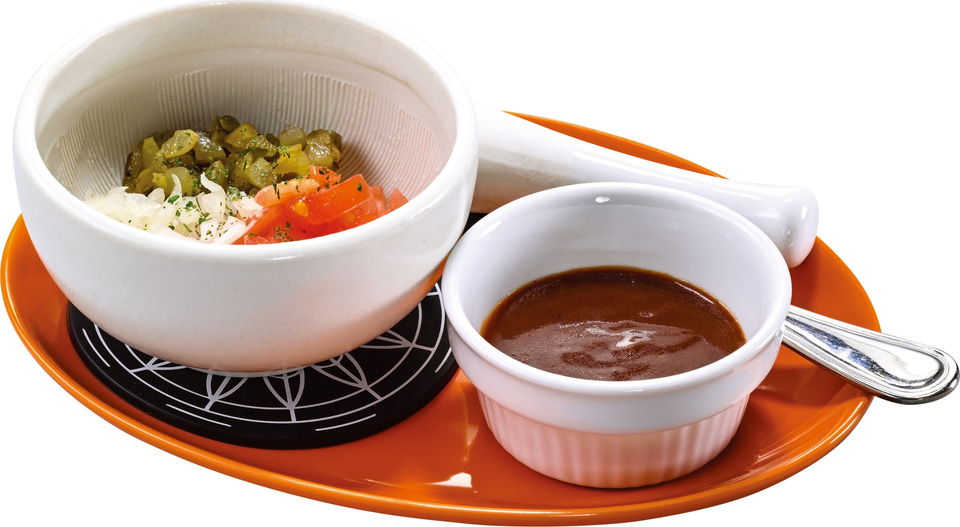 看板メニューである“大俵ハンバーグ”や燻製ベーコン、ポークソーセージにBBQソースと野菜を組み合わせたスモーキーでコクのあるソースを合わせた。期間限定で提供する「スモークBBQソース」は、すり鉢に入ったダイスカットの玉ねぎ・ピクルス・トマトを自分で好みの食感や味わいに擦って完成させるもので、野菜の甘みと酸味が際立ち、スモーキーな香りとスパイスの風味が食欲をそそる。