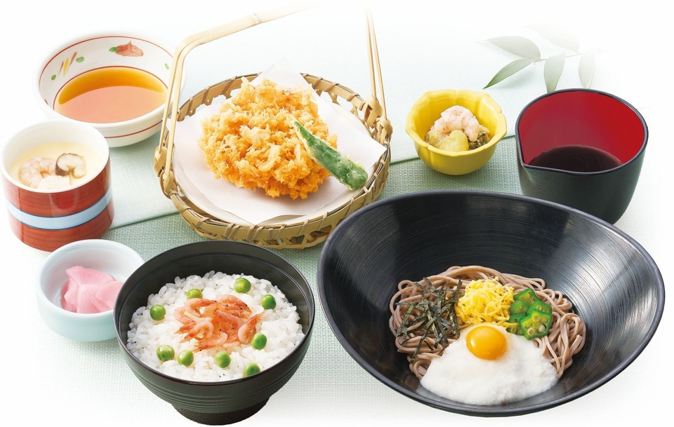 豆ごはんに月見とろろそばや桜海老のかき揚げなどを合わせた、初夏を味わえる御膳。