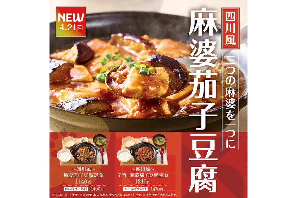 また、より刺激的な辛さの「~四川風~辛旨・麻婆茄子豆腐定食」、から揚げ小鉢付きの「【から揚げ小鉢付】~四川風~麻婆茄子豆腐定食」「【から揚げ小鉢付】~四川風~辛旨・麻婆茄子豆腐定食」もラインアップする。