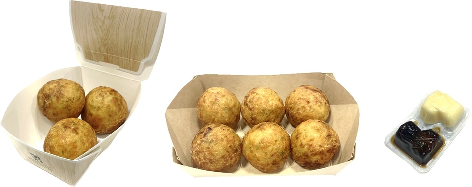店内で揚げて提供することで、生地のとろーり食感が味わえる。生地にはカツオベースのコクのある出汁を使用し、魚介の旨みが広がる味わいに仕上げているほか、大きめサイズにカットしたたこを使用することで、贅沢な食べ応えとなっている。たこ焼きソースとマヨネーズは別添えで提供する。