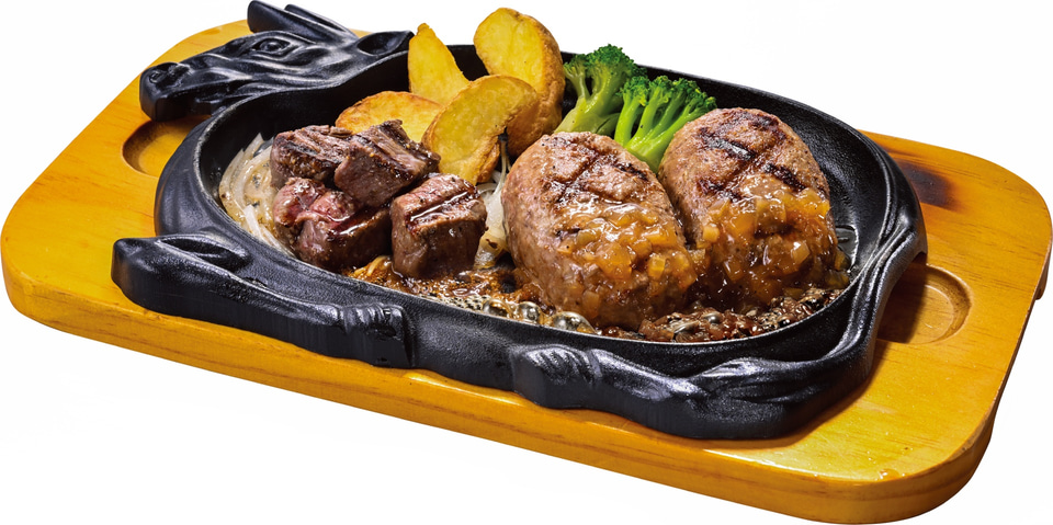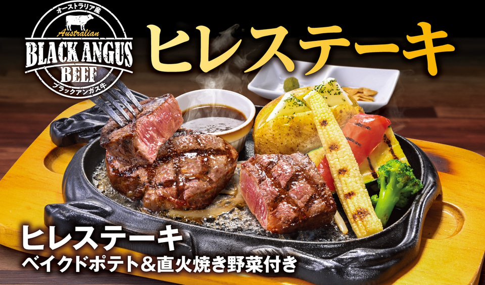 メニューは、ヒレステーキにベイクドポテトと、ズッキーニやヤングコーンなどの直火焼き野菜を添えた「ヒレステーキ ベイクドポテト&直火焼き野菜付き」、カットしたヒレステーキと“大俵ハンバーグ”が楽しめる「ヒレカットステーキ(80g)&大俵ハンバーグ」、グリルチキン(100g)とジューシーな手ごねハンバーグ(100g)を組み合わせた「ヒレカットステーキのトリプルグリル」が登場する。