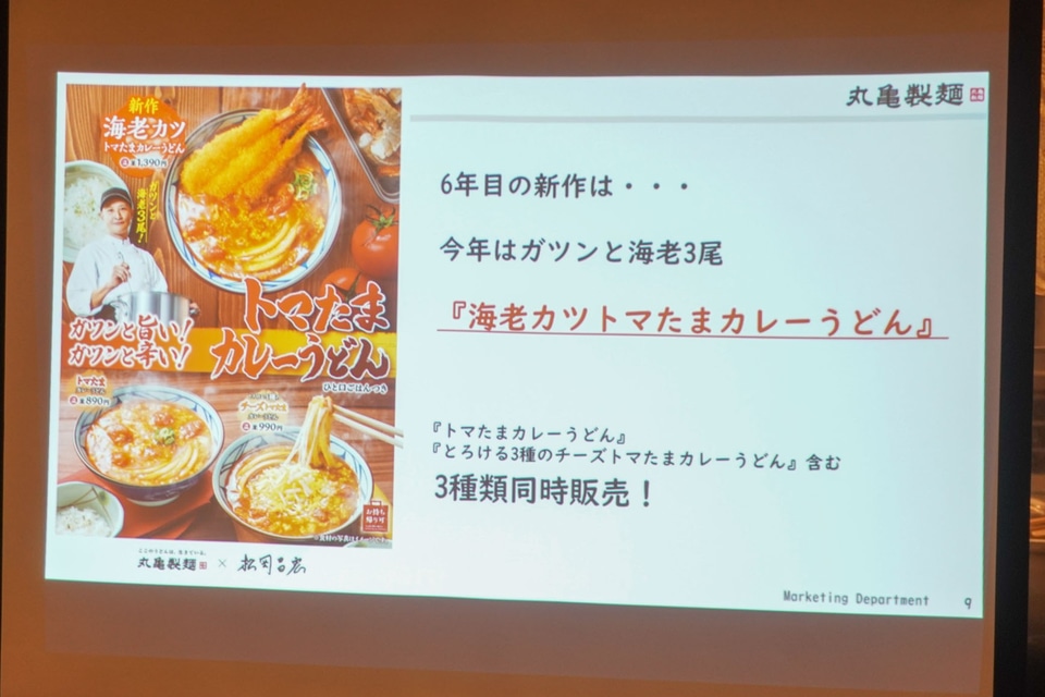 「トマたまカレーうどん」は2021年に発売し、松岡昌宏さんと共同開発しながら毎年販売してきた。打ち立てのうどんに合うものをと考えられた商品で、ニンニクやショウガなどが入ったガツンとした旨さと辛さが特徴。今回は、そこに海老3尾を重ねて揚げた海老カツを大胆にのせ、旨さと辛さに負けない味わいに仕上げている。