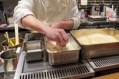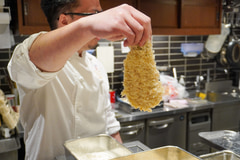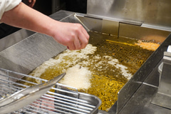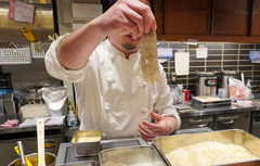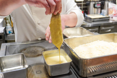 海老カツは注文が入ってから揚げる。海老3本まとめて天ぷら粉をまぶし卵などを合わせたバッター液をまとわせ、衣付け。それをフライヤーで揚げると、見事に3本合体した海老カツができあがる。茹でたうどんに風味豊かなトマたまカレーをかけ、揚げたての海老カツを添えて完成。