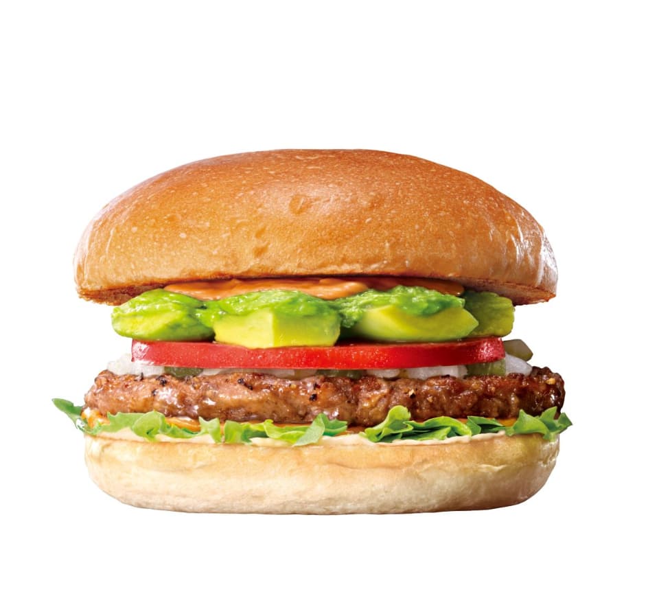 ビーフ100%のジューシーなパティに、ごろっと大きめにダイスカットしたアボカドとなめらかなワカモレソース、シャキシャキのレタス、みずみずしいスライストマト、スライスチーズ、特製オーロラソースなどをふっくらなめらかなバンズで挟んだ。クリーミーなアボカドと、やさしい酸味のオーロラソース、濃厚なチーズのコクが織りなす贅沢な味わいを楽しめる。