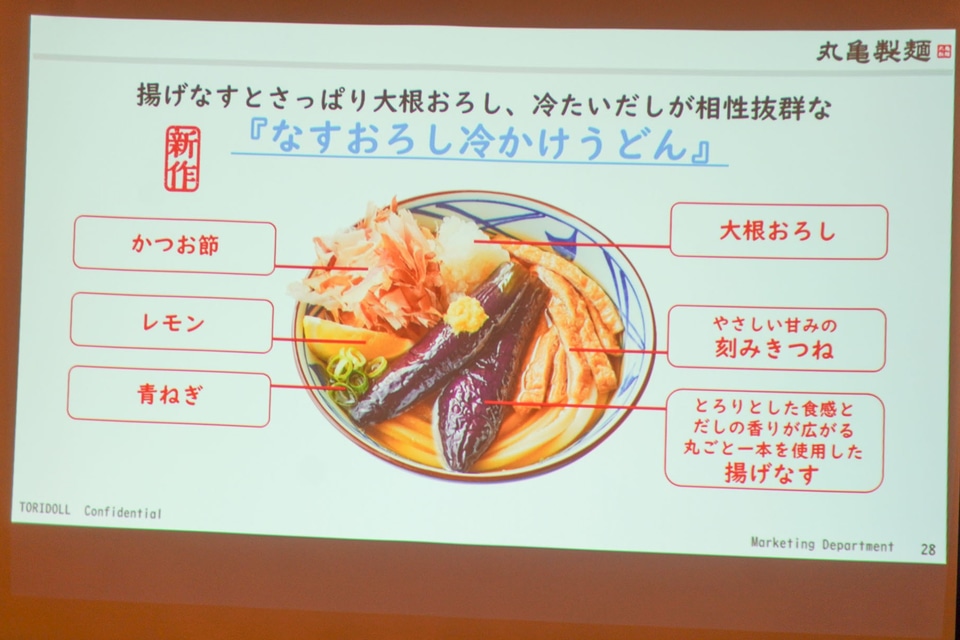 ひと足早く「なすおろし冷かけうどん」を試食したところ、大きめの揚げなすが中央にのっている。なすを食べると、とてもやわらかでだしがジュワッと出てくる。刻み揚げが甘めの味付けで、ほっとする存在。後半はレモンを絞ると、爽やかな香りと酸味でさっぱり味わえた。