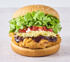 タイの屋台料理として親しまれるカオマンガイを表現した新作バーガー。ジューシーなクリスピーチキン、たっぷりの針生姜とトマトに、甜麺醤・コチュジャン・オイスターソースを重ねたオリジナルソースを合わせ、旨みと辛み、香りのバランスを追求した。旬の国産フレッシュパクチーの風味をアクセントに、本格的でありながら食べやすい一品に仕上げている。